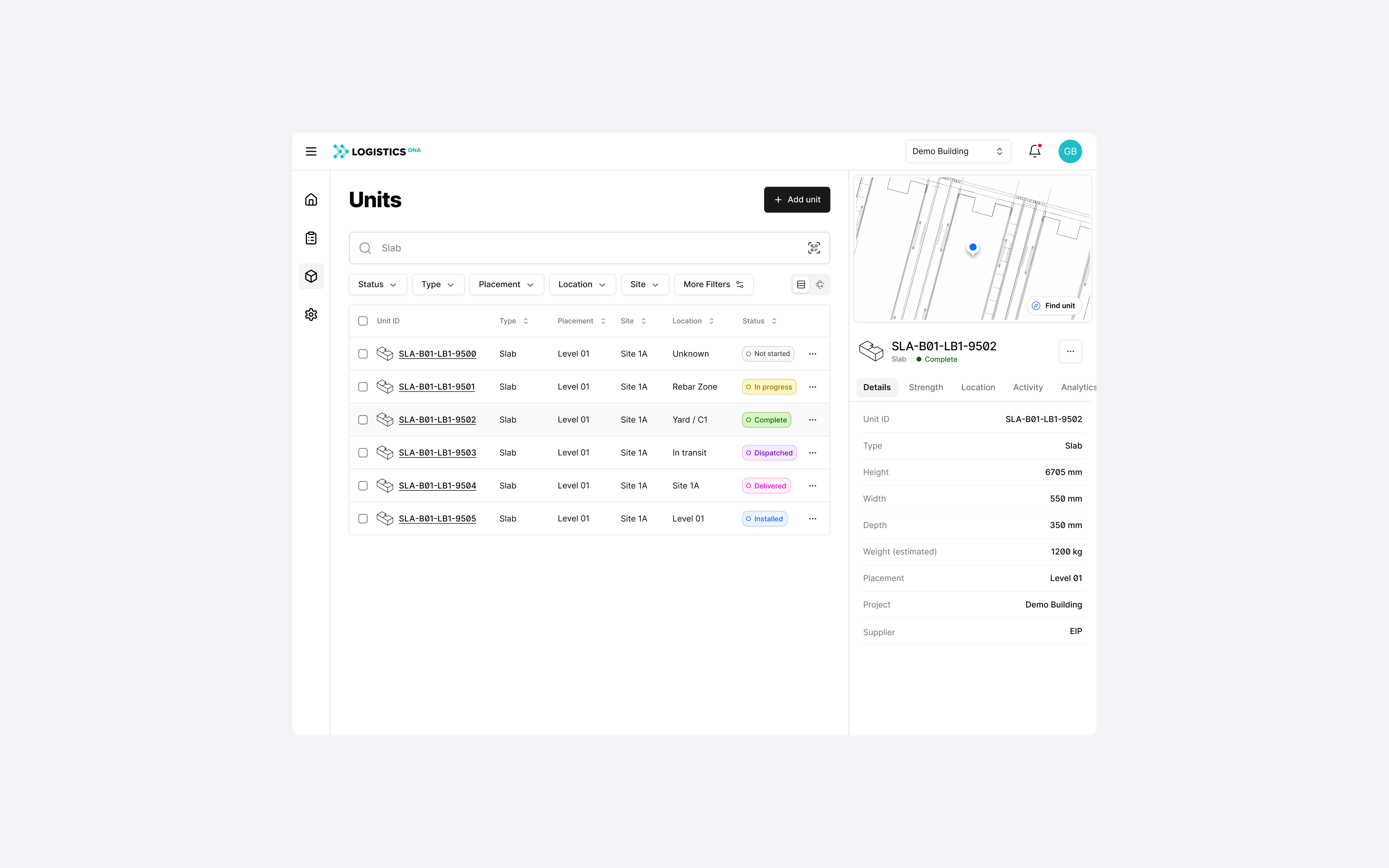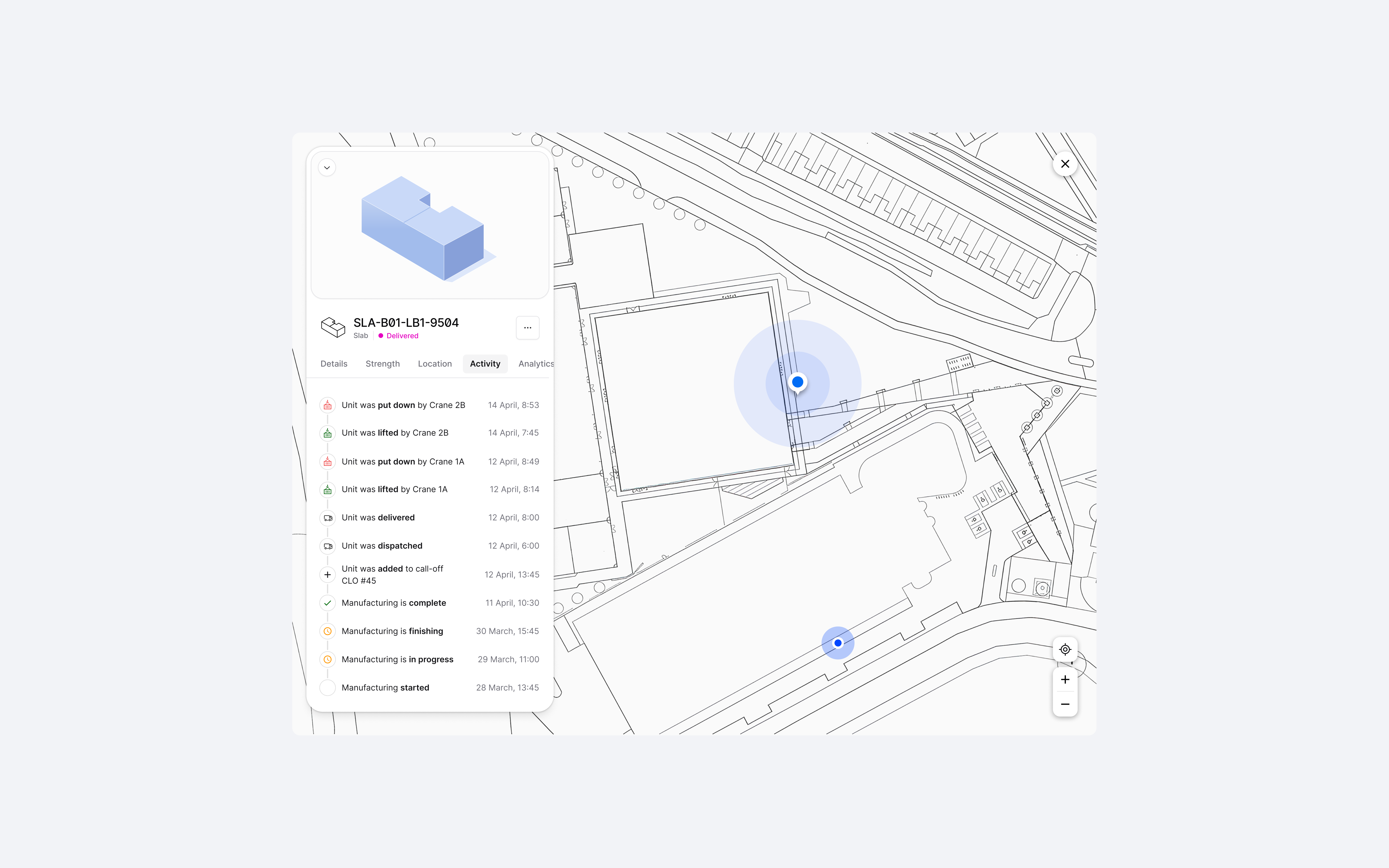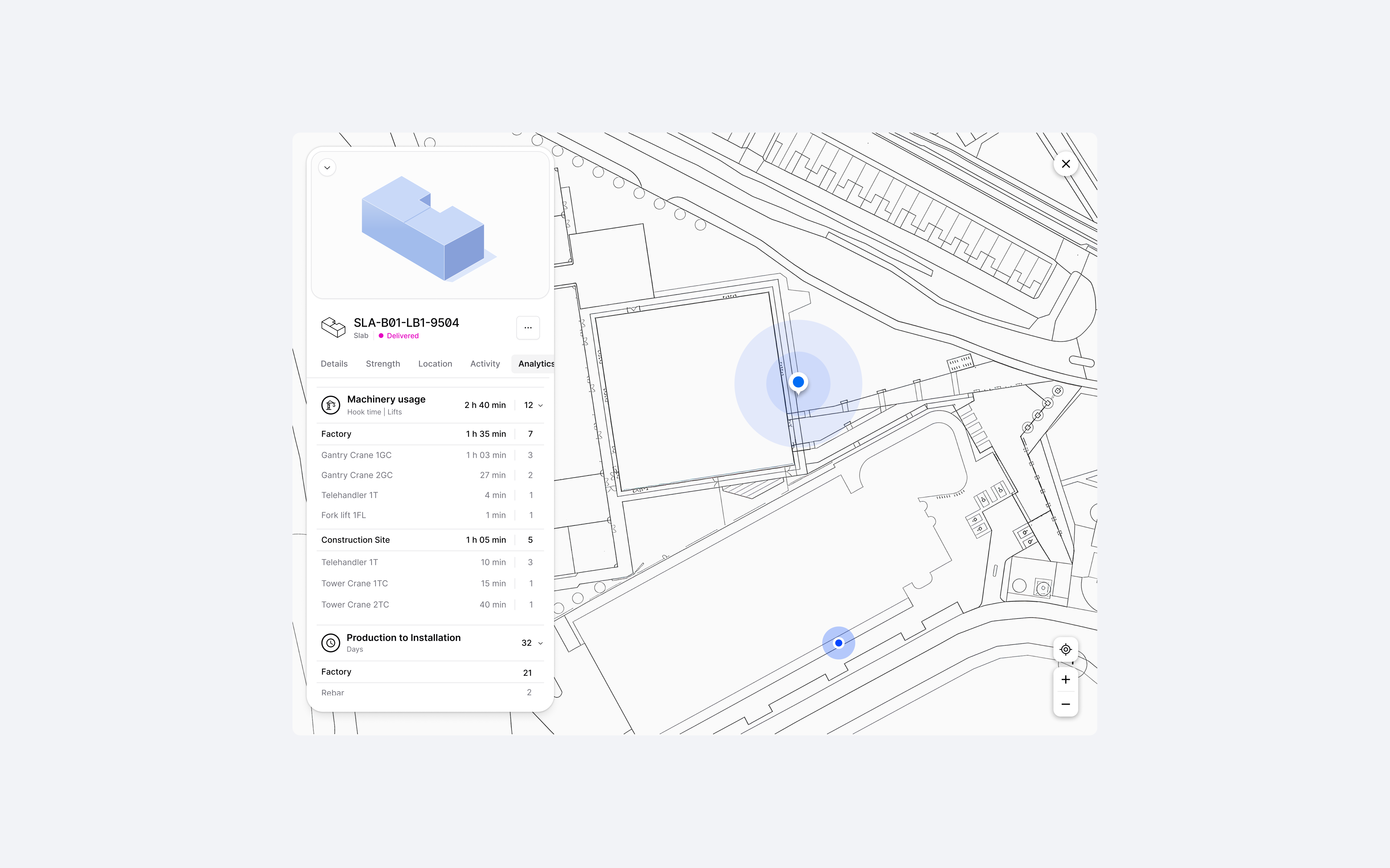 A prototype platform for the modular construction industry that tracks prefabricated concrete units from factory to installation. I led the research, design, and validation — resulting in a live MVP and paying customers within six months.